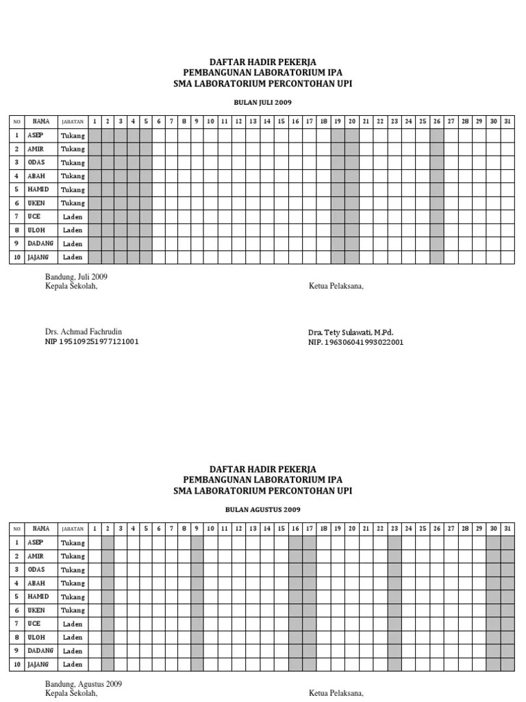 Excell /.xls) merupakan format yang diperlukan untuk pengisian absensi dan pembayaran upah pekerja dan . Harga jasa tukang bangunan 2018 _ jasa tukang bangunan murah. Daftar hadir tenaga kerja harian (hok) proyek riset ekstensifikasi pertanian pt pupuk indonesia kab. Template ini merupakan hal yang paling sering dicari, template yang kami bagikan cukup lengkap untuk pendataan absensi karyawan. Dapat disesuaikan, dengan kode warna, dan melacak secara bulanan.